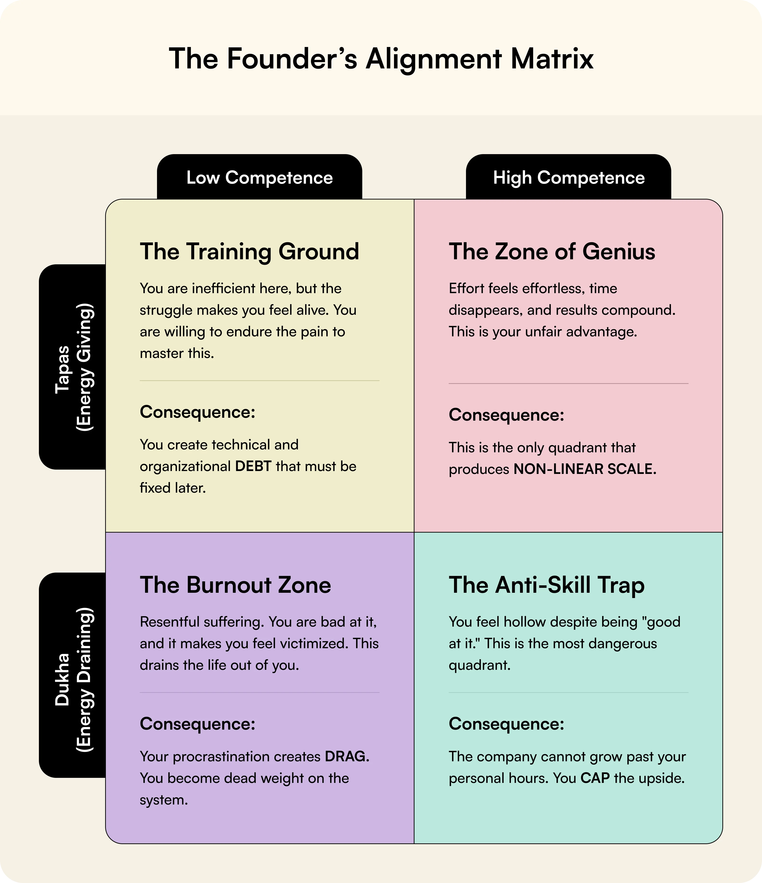Now you understand your Internal Design - your Tapas and Anti-Skills. But here's where most founders get stuck: They think the solution is to "fix" their Anti-Skills through discipline and grinding.